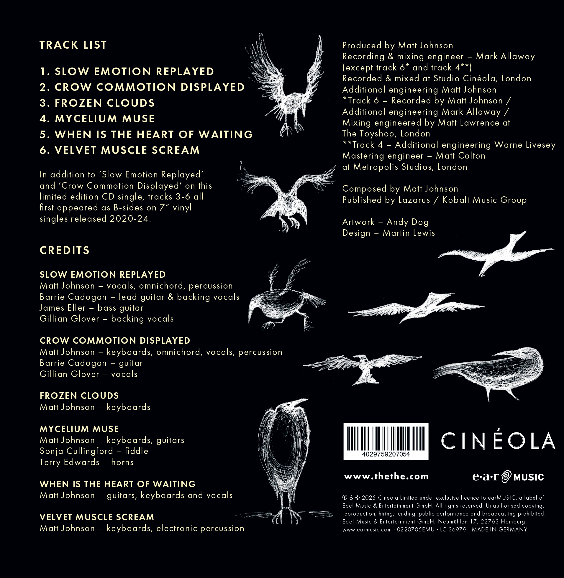 This limited vinyl-look CD features not only ‘Slow Emotion Replayed’ and its corresponding B-side ‘Crow Commotion Displayed’, but also 4 additional tracks which first appeared as B-sides on THE THE’s recent 7” vinyl singles released 2020-24:
