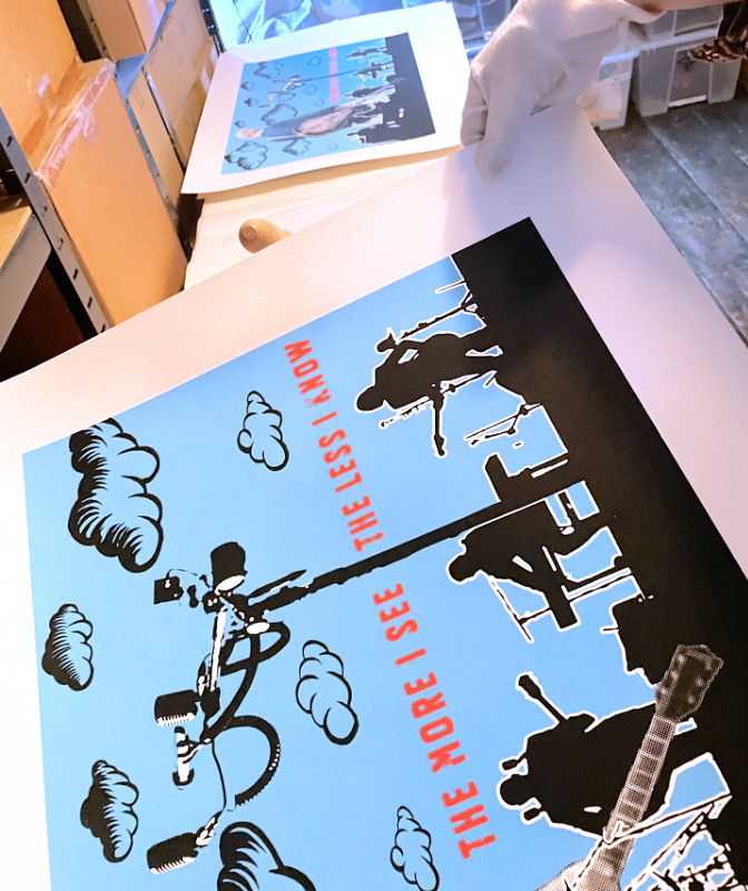 This screenprint creates an interplay between lyrics from ‘Slow Emotion Replay’, the cover photo used for The Comeback Special, a film still of all the band in silhouette and rendering of clouds from the pages of Andy Dog’s sketchbooks.
